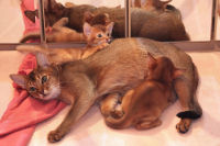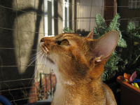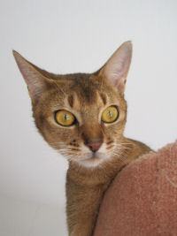 Die Augen sind groß, leuchtend und ausdrucksvoll, leicht mandelförmig und weit auseinander gesetzt. Die Augenfarbe ist rein und klar, bernsteingelb bis grün. Bei silberfarbenen Varietäten wird grün bevorzugt. Die Augenlider sind bei allen Farbvarietäten in der Farbe des Tickings umrandet (Lidstrich). |